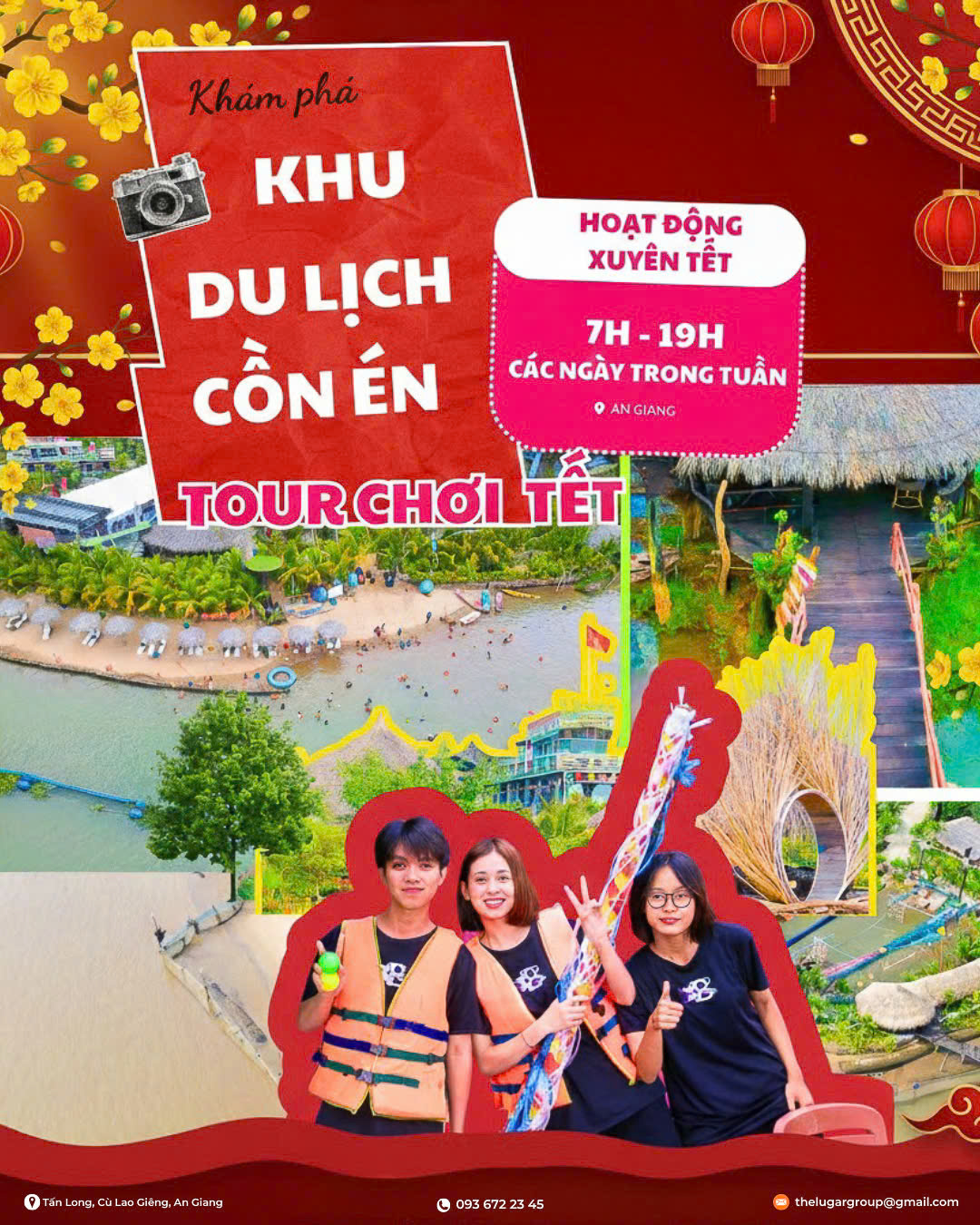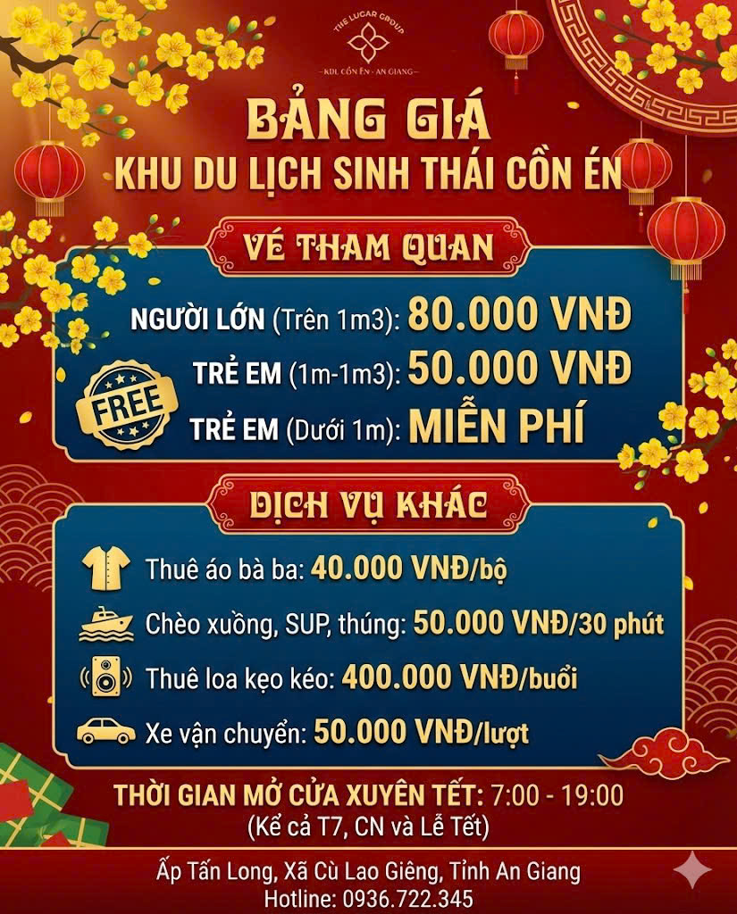 Tết ở Cồn Én không cầu kỳ, mà ấm áp theo cách rất miền Tây. Không gian được trang trí với hoa mai, hoa đào, lồng đèn, mâm ngũ quả… xen lẫn những góc “Chợ Tết Miền Tây”, “Tết Cổ Truyền”, “Xuân về trên Cồn” – đủ để du khách thong thả dạo chơi, chụp vài tấm ảnh xuân và cảm nhận Tết đang đến thật gần.